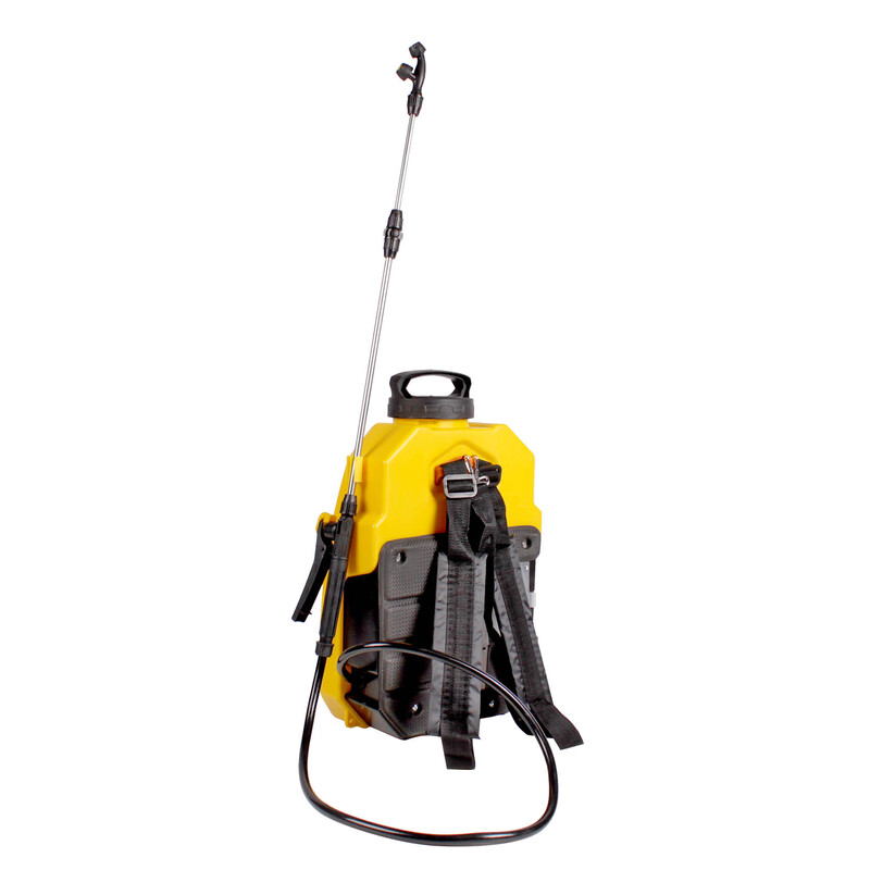 Аккумуляторный садовый опрыскиватель оборудован 12-литровым баком для жидкости, который функционирует от NI-Cd батареи (встроена в изделие). Устройство применяется для работ в саду: обработки удобрениями или бережного орошения растений. Имется регулировка подачи жидкости. Ранцевый эргономичный ремень с мягкой подушкой обеспечивает удобство перемещения. Давление создается одним нажатием кнопки. Благодаря широкой горловине основной бак легко заполнить жидкостью.