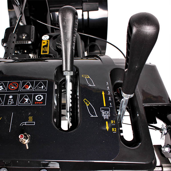 - Регулировка направления выброса — оператор контролирует процесс при помощи рукояток на панели;